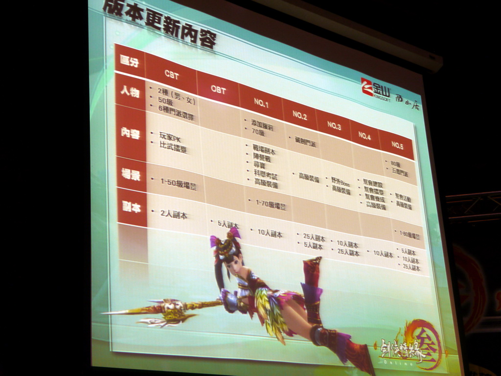 》在台灣的內容計畫,公測時將會開放五人副本,之後第一階段會開放至 70 級、加入蘿莉角色供玩家選擇,並且開放戰場副本、陣營戰、尋寶、科舉考試、高級裝備等,第二階段再開放高級裝備,第三階段開放野外 BOSS、高級裝備,第四階段開放幫會建設、幫會擂台、幫會養成等,第五階段將會開放至 80 級與五毒門派。