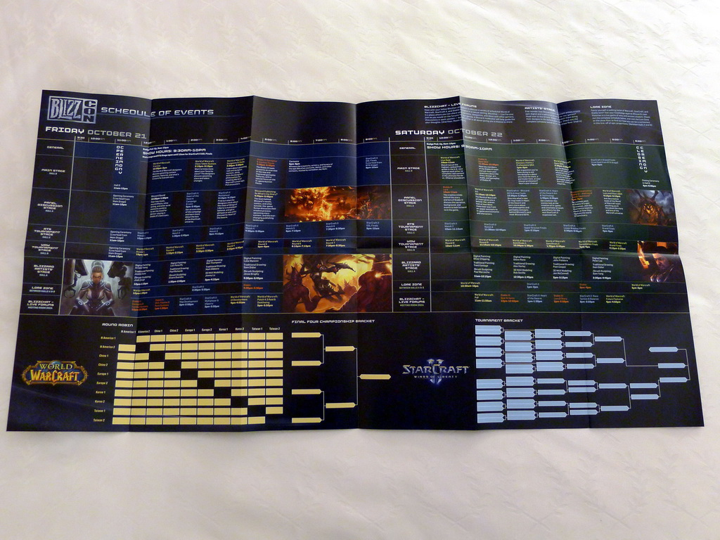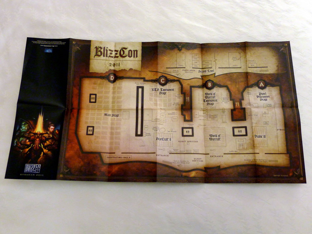至於福袋中也有 BlizzCon 2011 展場地圖,詳列會場四大舞台與活動,從地圖上可以看到各館配置,除了以往展示的凱莉根、雷諾、伊利丹、冰封王座等,今年在 A 館也將會有泰瑞爾的雕像。至於三大遊戲《