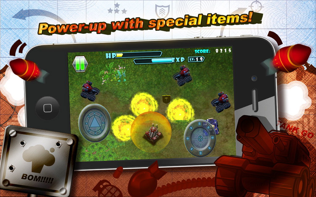 3D TANK GO》中,玩家將駕馭一台拉風帥氣的坦克車展開激戰,簡易明瞭的操控設計,不僅可輕鬆操作坦克車方向,還能依敵人方向來轉動坦克炮台快速應戰!在全 3D 畫面的戰鬥場景中,四面八方隨時都有可能有敵方陣營坦克出沒,玩家必須專心觀察周圍環境,瞄準敵人發動炮彈精準進攻!透過手機也能盡情享有緊張刺激的掌機激鬥樂趣!大舉殲滅敵營後,還有機會贏得隨機掉落補品或強效道具,藉此提高玩家角色戰鬥實力!