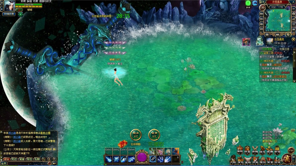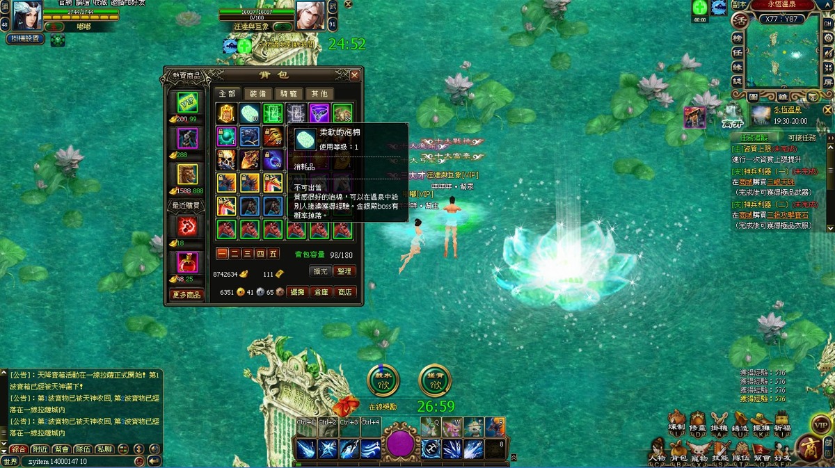 進入溫泉內就可以持續性獲得經驗和靈氣;特別的是,當其他玩家進入溫泉區,每個玩家可以對其他玩家進行 5 次『戲水』和 5 次『搓背』,戲水和搓背可以得到額外的經驗獎勵;搓背時每次需要消耗 1 個在金銀殿中擊殺 BOSS 怪所掉落的“柔軟的泡棉”道具,而每次戲水後,需要等待 2 分鐘才能夠繼續戲水,每次搓背後,需要等待 2 分鐘才能夠繼續搓背。