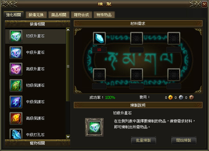 永恆之歌》當中,這次新增的煉製系統,可將低階的物品合成為高階物品,讓玩家以最大限度使用遊戲中的各種道具,只要點擊主介面右下角“煉製”打開煉製系統面板,選擇任何一件想要合成的物品,在材料需求欄中會顯示合成當前物品所需要的所有材料及個數。當背包中的材料滿足要求的個數時,數字的顏色變為白色,相反物品下面的數字就會變成紅色。另外如果材料足夠,還可以使用快捷的批量煉製。