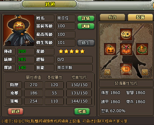 自即日起至11月19日官方更推出了相當應景的〝南瓜怪來襲〞活動,活動期間只要攻打營寨就有機會獲得道具「南瓜」、「糖果」、「掃把」與「巫婆帽」,集滿這四個道具並使用其中一種,就會合成「萬聖節驚喜寶箱」,寶箱內有驚喜南瓜道具與糖果盒,玩家將有機會開出像是五星將『南瓜怪』、『南瓜面具』、『南瓜戒指』與『南瓜派』等搞怪道具,超有趣的萬聖節特別活動,玩家可千萬別錯過了唷!