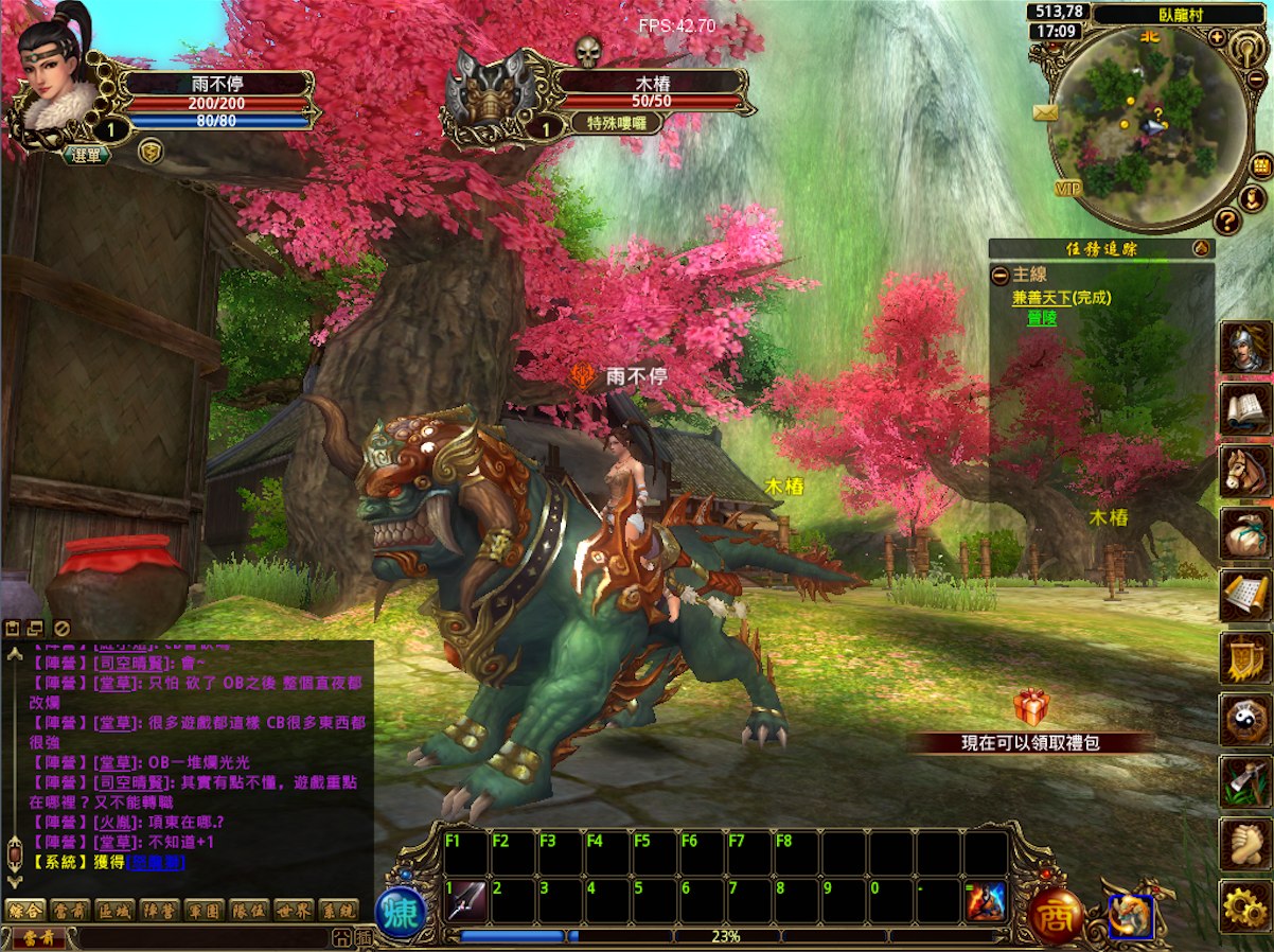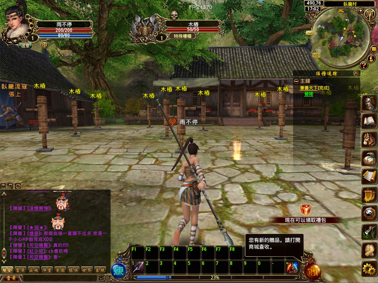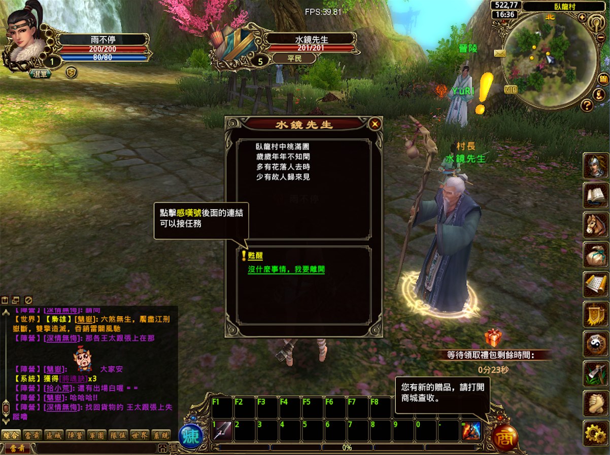 與一般RPG遊戲一樣,開始遊戲前要先創建角色,玩家選定職業、外觀及陣營完成角色設定後即可進入遊戲,各職業介紹在此就不多贅述。一進入遊戲,玩家會先進入開滿桃花的臥龍村,遇到第一個NPC「水鏡先生」,點擊滑鼠右鍵即出現任務對話框,點擊黃色驚嘆號後面的連結後即可領取任務。建議想快速衝級的玩家可循著主線任務,解任務快速賺取經驗值,不然遊戲裡初期打一隻怪只有十幾的經驗值,心酸吶!