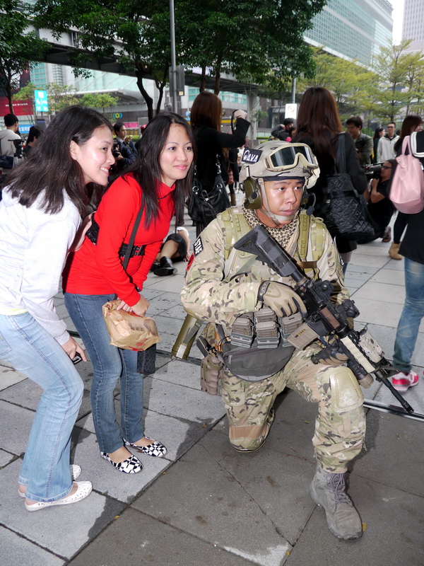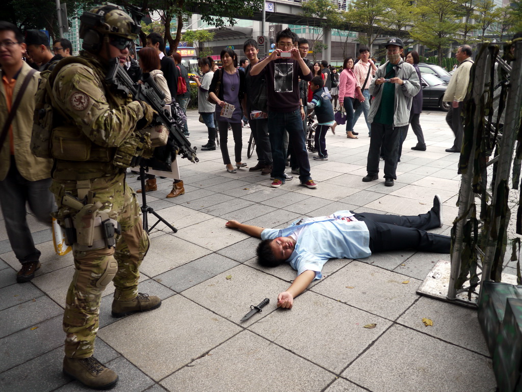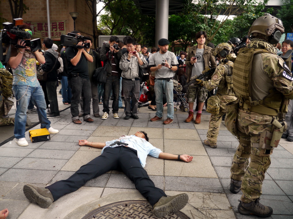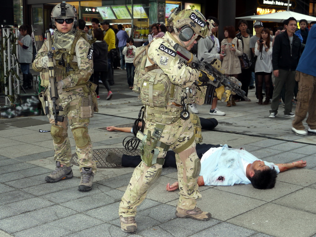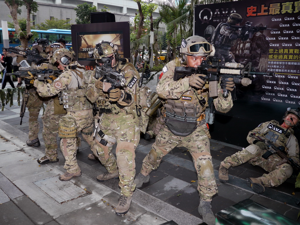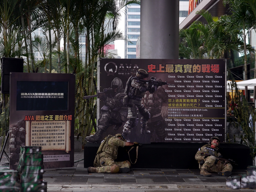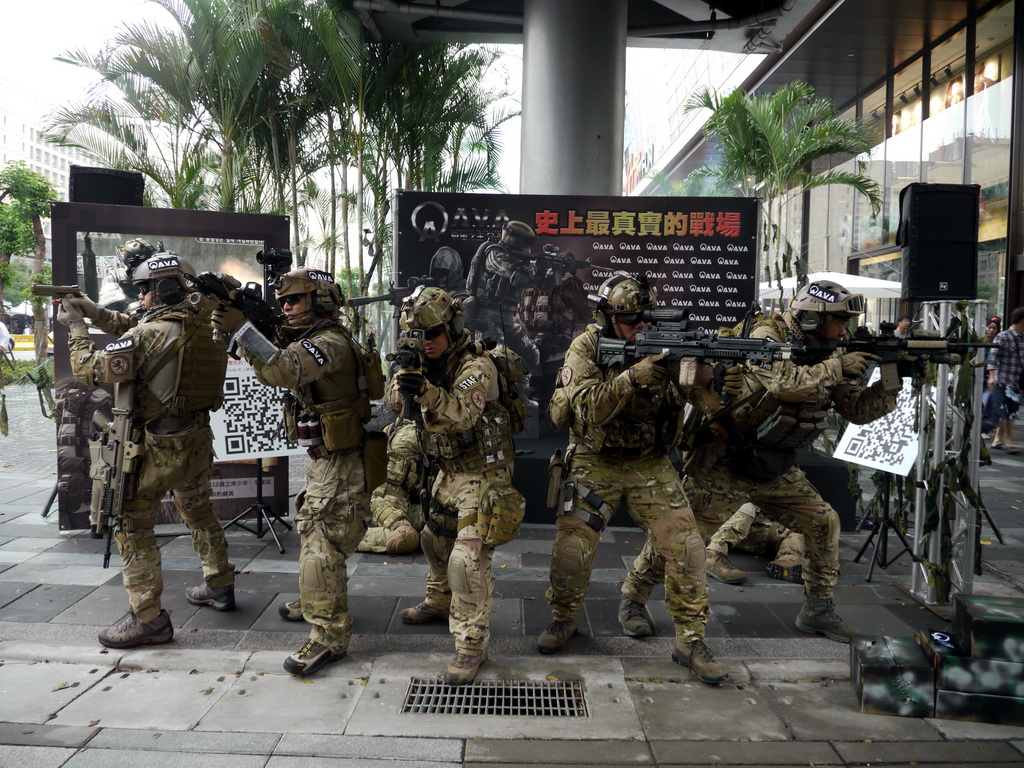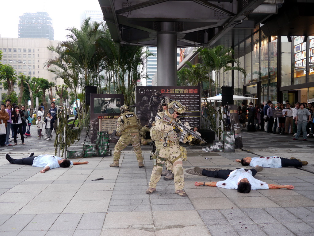 戰谷週六下午在信義商圈舉辦《AVA 戰地之王》實境秀與活體裝置展,活動一開始只見百貨商場旁有兩名嚴重燒傷、頸部被割喉的游擊兵臥倒在地,隨後一群裝備齊全、甚至背有精良火箭砲的 AVA 特種軍隊現身,與甫從 AVA 重罪監獄逃出的三名逃犯進行對峙,為求快速逮捕逃犯並避免傷及無辜,五名重裝士兵不時尋找有利的射擊點以制伏逃犯。