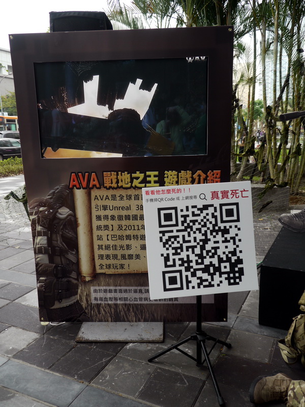 在逼真的都市街頭槍戰活動後,遺留在現場的是戰爭後的殘酷景象,躺臥的「活」屍體與 AVA 特種軍隊吸引讓不少行人駐足拍照,而戲谷特別旁架設 QR Code 展示牌,讓民眾可透過智慧型手機的科技,了解此次爭戰的始末,讓街頭槍戰可將《AVA 戰地之王》的遊戲畫面呈現於現實世界中,希望藉由 QR Code 的設計帶領民眾從現實世界中的「扮演」重新回到虛擬的遊戲畫面中。