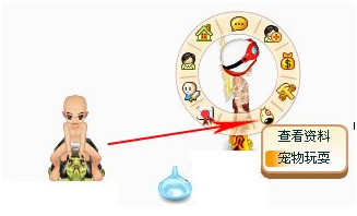 二.然後,我們可以點擊好友人物形象,你會看到1寵物圖示。點擊寵物圖示會顯示選項,可以查看寵物資料,跟寵物玩耍。如果點自己人物形象中的寵物圖示,還能看到寵物培養和與寵物對話。