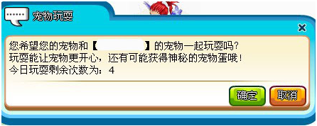 三.點擊“寵物玩耍”按鈕,會彈出提示玩家今天還有多少玩耍次數,點擊同意後會發送玩耍邀請給好友。寵物玩耍次數由寵物等級決定,不同等級範圍的寵物會有相應的玩耍次數。每次玩耍成功,都會減少1次玩耍次數。