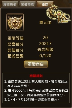 | 玩家可利用官銜商店購買獨有的特殊裝備 |