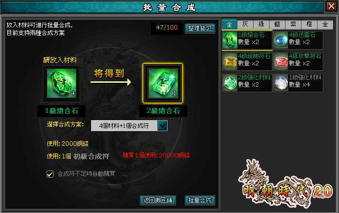 明朝時代》推出「批量合成」功能,方便將士們合成靈石、強化材料等物品,幫玩家們縮減了大量的等待工時。