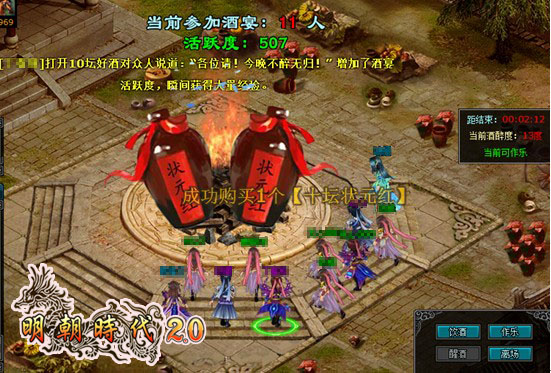 玩家們在每天晚上10時進入「篝火酒宴」,即可輕鬆獲得相當於免費的雙倍校場,還可以得到活躍度的額外經驗加成,除了雙倍校場經驗外,酒宴的活躍度也會對掛機經驗有著明顯的加成,在酒宴中每多1名參與者即會增加1點活躍度,獨飲一壇酒則會增加2點活躍度,與他人同飲十壇酒可增加20點活躍度,而活躍度最後也將以1:1等比轉化為掛機經驗加成,所以玩家們只要邀請越多人同樂,喝越多的酒,能得到的掛機經驗也會相對得越豐厚。