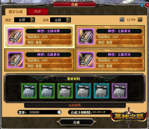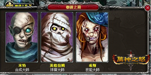 萬神之怒》中的裝備合成、鑲嵌系統與技能大師比鄰而居,找的到技能大師的地方,就可以找到合成大師以及珠寶大師。『合成大師』提供了兩種合成服務,一種是固定合成,玩家於任務中或是打怪時獲得的固定材料道具,收集齊全,就可以找合成大師進行合成。另外一種是高級合成,玩家可以將不同的品質的裝備(寶石),用一定的數量合成比較高階的裝備(寶石)。