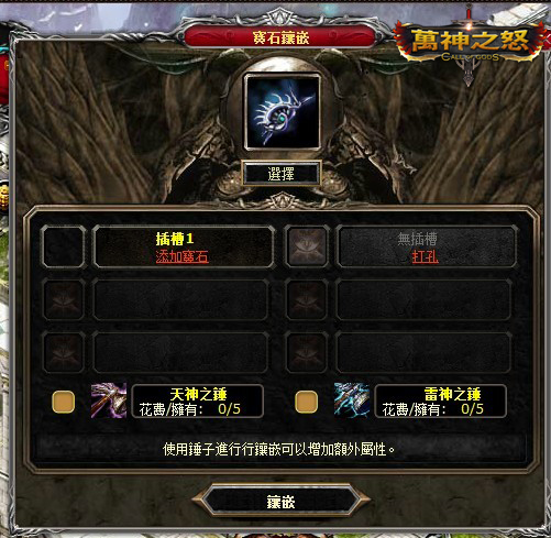 『珠寶大師』則提供了裝備的的鑲嵌、打孔等服務。在此,玩家可以為自己的裝備,鑲嵌上不同等級的寶石,或是為自己的裝備打孔,創造屬於自己獨一無二的神兵利器。在寶石鑲嵌系統內,玩家還可以透過由任務取得的天神之錘或者雷神之錘來提升 6%~15% 寶石附加的屬性。