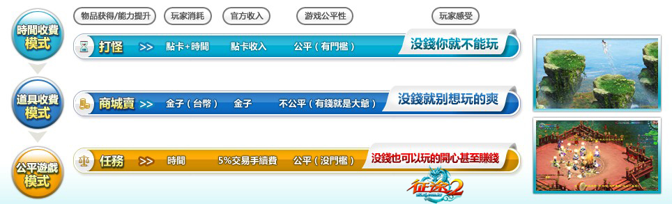 過去的線上遊戲從最早的「月費制」到近期流行的「商城制」模式,兩個模式都各有其利弊,月費遊戲玩家得先掏錢然後沒日沒夜地升級收裝備,而免費遊戲則往往會因為商城道具的使用,無情且快速地破壞了遊戲的平衡,如今《