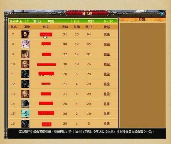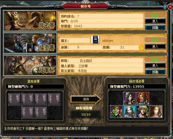 「競技場」分為個人賽以及擂臺賽。個人賽的部分著種在個人裝備、陣行、兵種的運用配合,加上通過各種因素搭配所引發的同等級 PK 輸贏各有不同,玩家可以再與其他人競技的過程中,及時瞭解到別人的戰術運用以及兵種搭配的神奇之處。