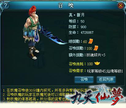 玩家們可使用元寶在指定 NPC 那裡選擇想要招喚的妖怪,怪物招喚出來後,則會出現相關的戰鬥資訊,並且立即進入 PK 模式,而一旦順利戰勝招喚 Boss,系統將會以禮卷的形式將所花費的元寶全額回饋,更有機會因而得到可用來兌換開出寵物魂玉的「妖魂碎片」虛寶。