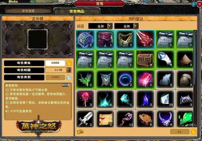 拍賣行內玩家可以將需要拍賣的道具寄放。