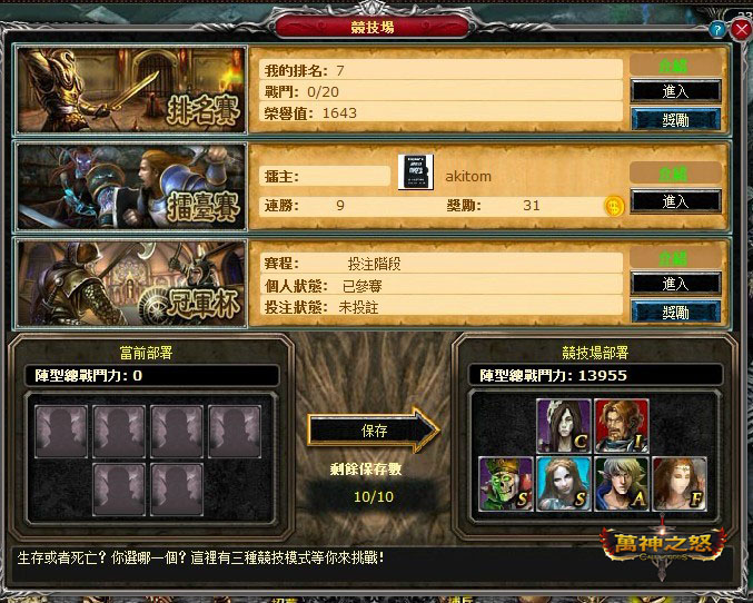 競技場分為個人賽以及擂臺賽,玩家可以在與其他人競技的過程中及時瞭解到別人的戰術運用以及兵種搭配的神奇之處。此外競技場中另外一個重要部分就是擂臺賽,在擂臺賽中每個玩家都可進行報名並繳納極少報名費用,只要打贏擂臺,即可獲得所有累積下來的巨額獎金。
