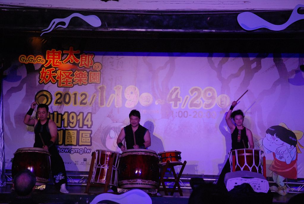 | 以充滿氣勢的太鼓表演位記者會開場,現場並已昏暗的藍、綠色燈光營造鬼怪的氣氛 |