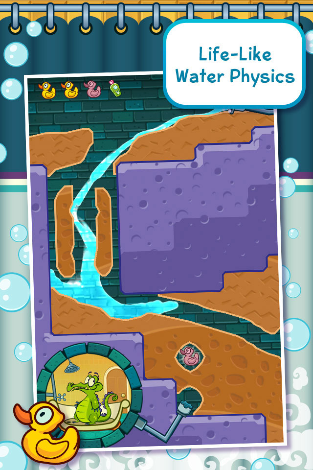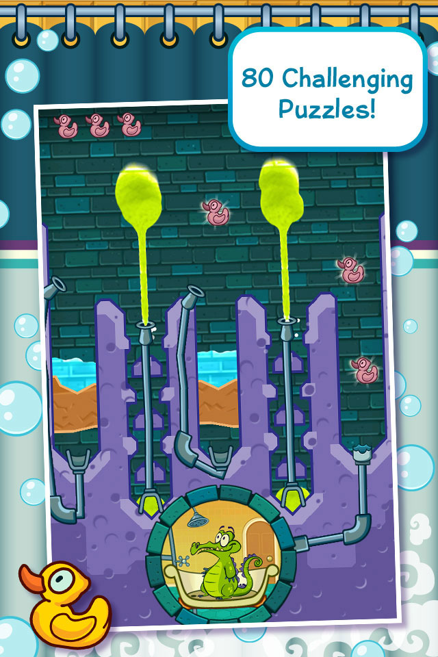 鱷魚小頑皮愛洗澡》是一款基於物理化學原理設計的解謎遊戲,主要是以完成鱷魚小頑皮的洗澡任務為主,因為小頑皮的接水管道斷了,玩家要負責讓水再接流起來。遊戲完全發揮觸控手機的特性,擁有多點觸控設計、高畫質圖像解析細膩呈現栩栩如生的世界、還有感染力極強的迷人配樂。如果想要闖關成功,玩家需要很聰明,還要小心藻類、有毒螢光軟泥,各種機關和陷阱。