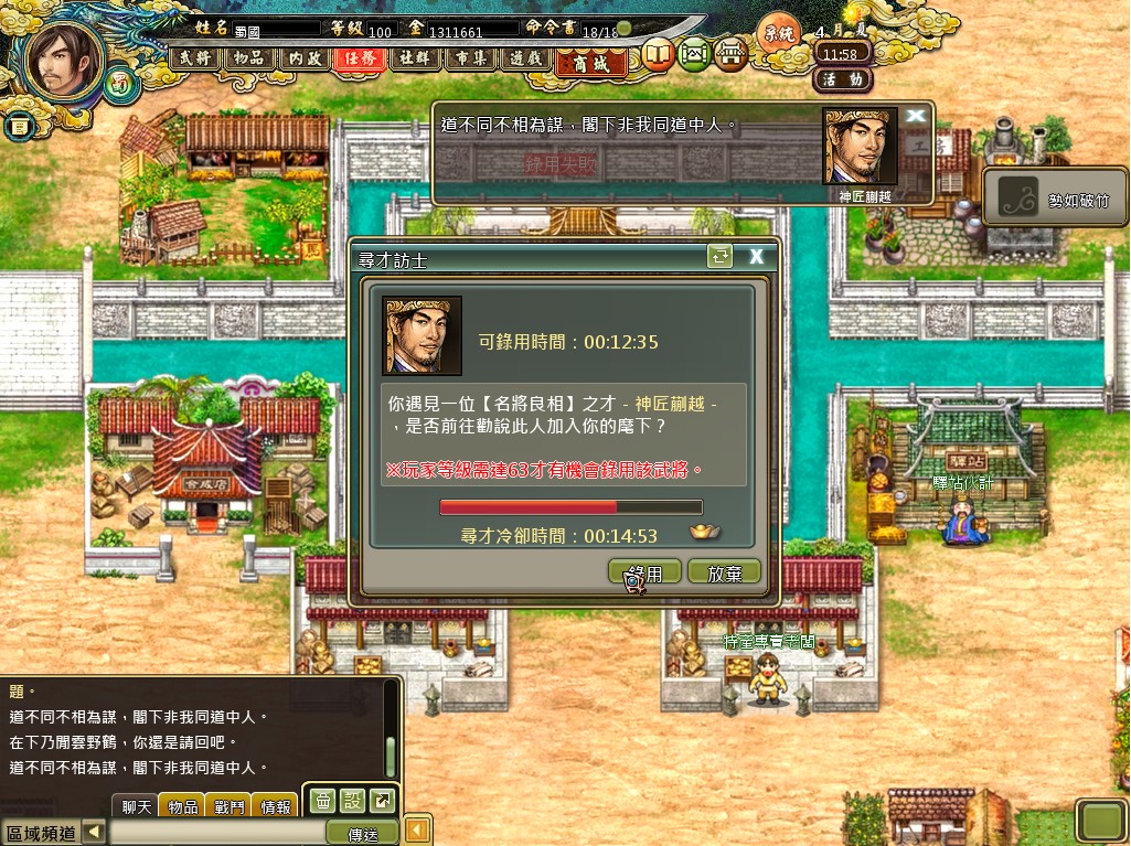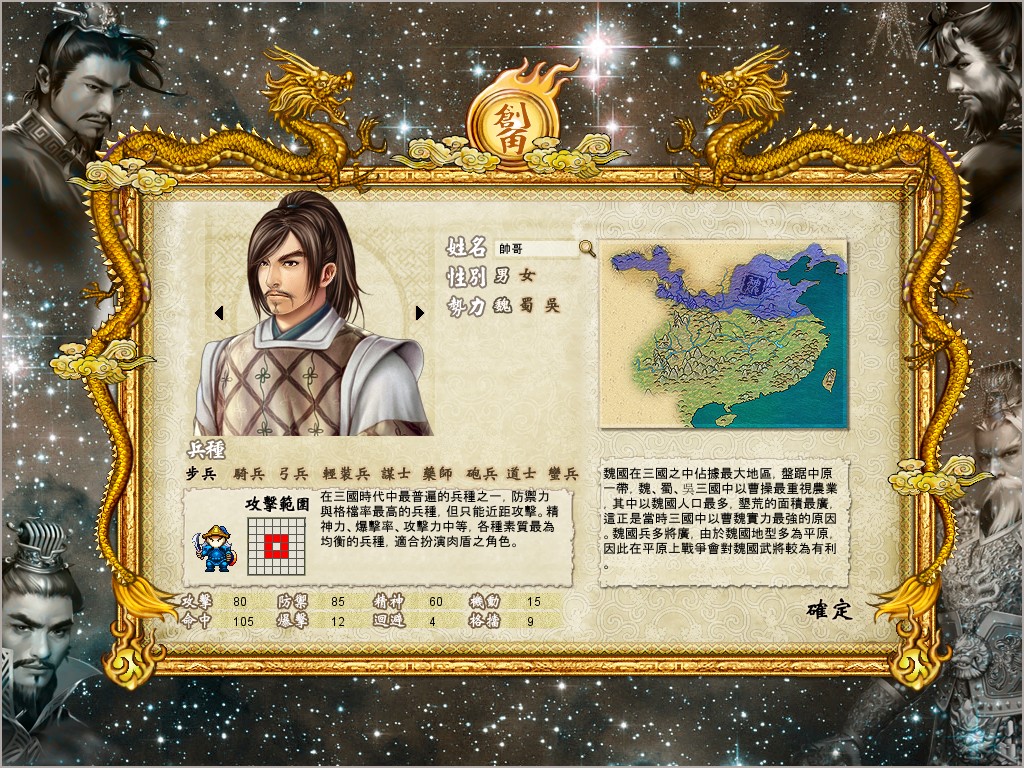 而武將在遊戲中佔了舉足輕重的角色,一樣的武將在先天上會分為三種等級,依序是普通、良好、優秀,在素質上自然是越後者越好,所以想要獲得越高素質的武將,玩家們可得用心好好的重複取得,直到獲得素質最高為優秀的武將。