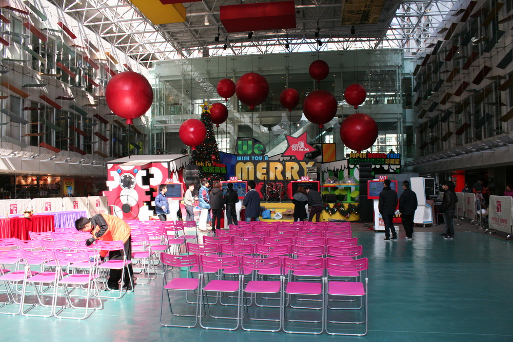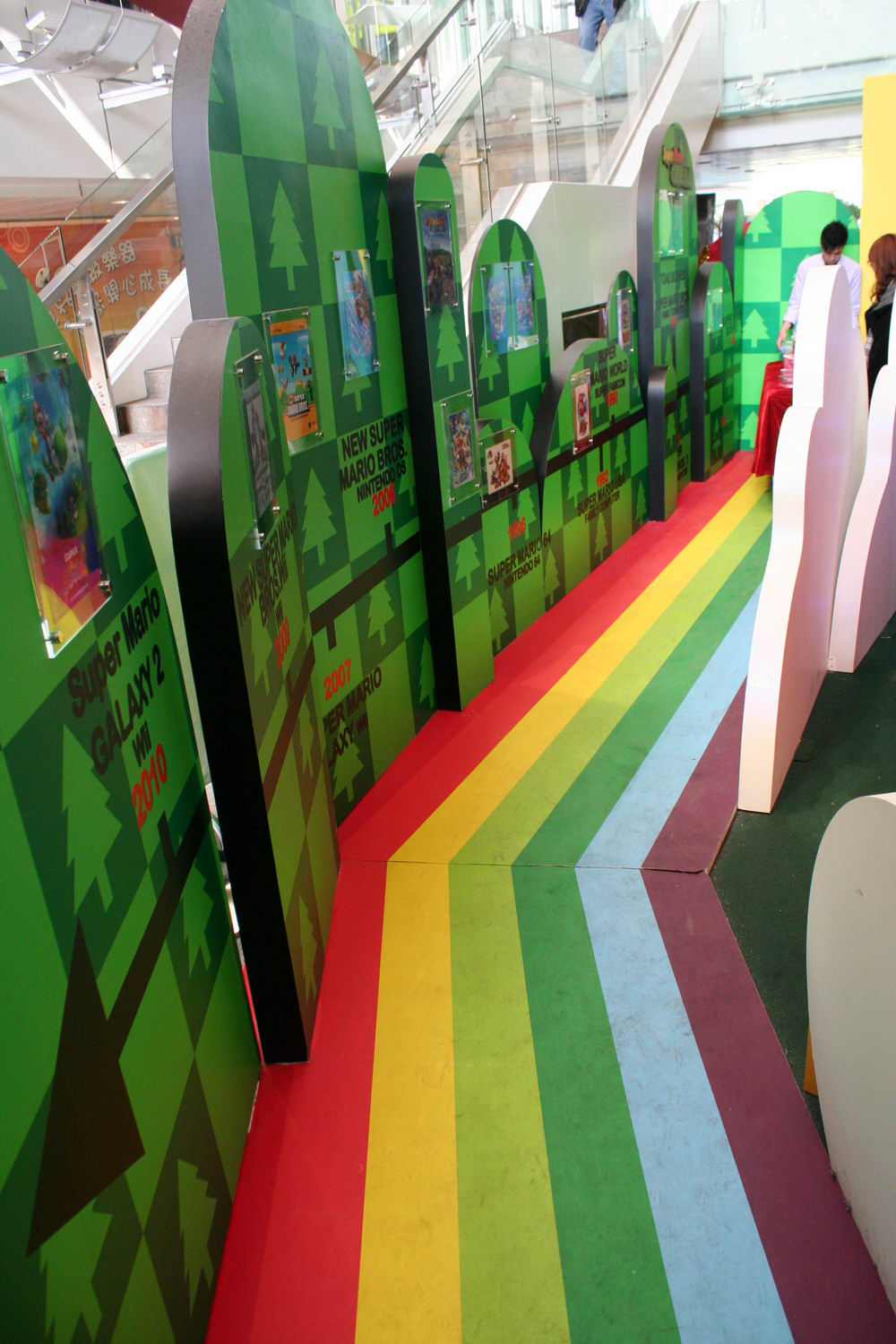 | 通道布置成彩虹橋,展示各代遊戲封面 |