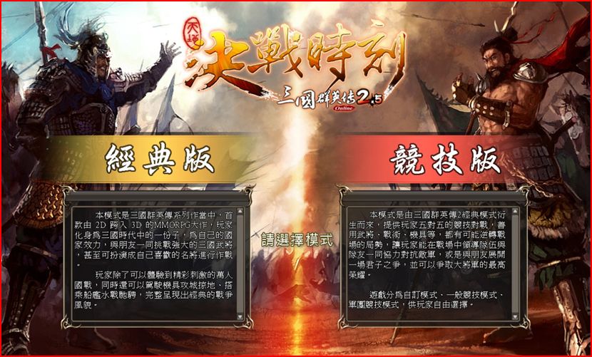 三國群英傳 2.5 Online》預定於 1 月 12 日推出「決戰時刻」改版,本次改版除請來「金光布袋戲」旗下經典布袋戲人物「史豔文」、「藏鏡人」與「黑白郎君」擔任遊戲代言人外,全新 DOTA 血統「競技版」和 RPG「經典版」雙系統,以及等級上限的開放、傳奇職業「拳士」二轉、全新高等副本以及首度推出的 30 人團隊副本都將一併開放,期望為玩家帶來與眾不同的