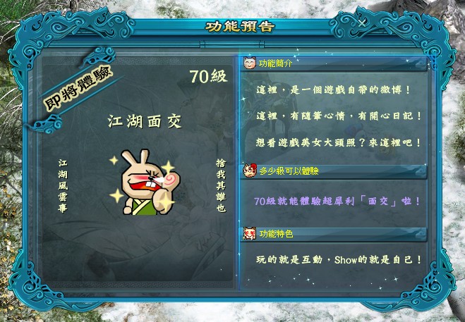 遊戲中同時也內建了「微網誌」系統,玩家只要等級達到 70 級就可以使用「江湖面交」功能,玩家可以將遊戲經歷、生活點滴等事情寫成一段話,通過江湖面交隨時隨地的分享給朋友或者其他玩家。通過面交可以增加自己在遊戲內的關注度,發展自己的粉絲。除此之外,玩家還可以自己上傳個人頭像,編輯自己的個人資料,開創個人專區。