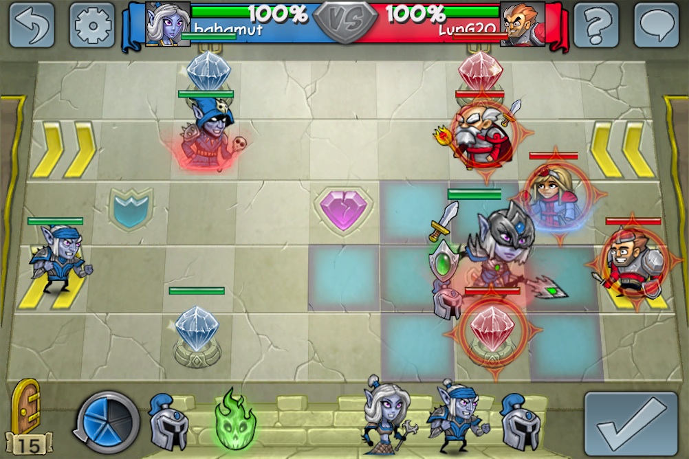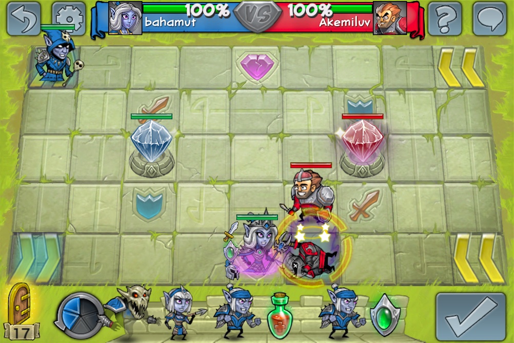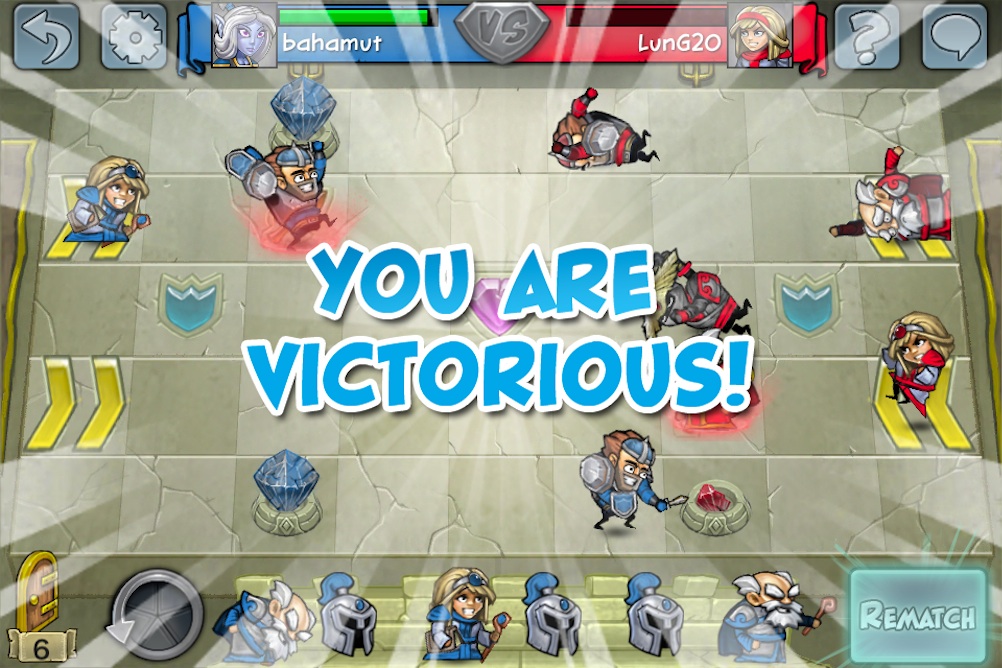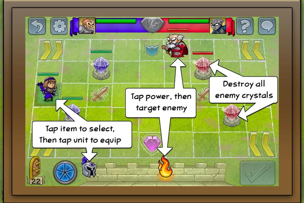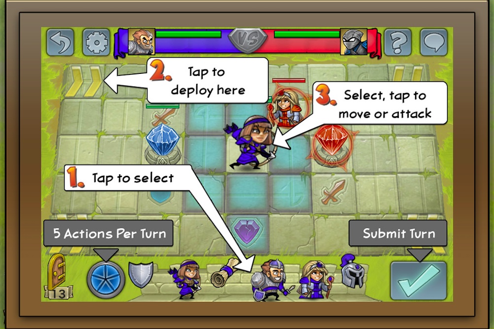 至於遊戲的玩法也非常簡單,雙方同意對戰後將進入 9 乘 5 的棋盤中,每位玩家每回合可執行五次動作(Actions Per Turn)來移動、攻擊、放置英雄或使用道具等等,當五次機會用完後再按下送出鍵(Submit Turn),就換成對方的回合來進行下去,期間還要好好保護己方的水晶塔,同時也要攻擊對方的,當成功摧毀對方的水晶塔或殲滅所有英雄,就算該場勝利了。