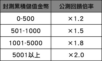 活動內容:封測期間玩家累積儲值金幣符合一定額度,遊戲公測時便會以相對倍率回饋給玩家。