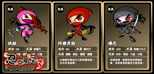鬼島年度大改版,除了地圖與關卡難度升級之外,守護著「怪木城」和「鬼島」的主要戰力「鬼族」,也都變成了更危險更難纏的敵人。有善用伊賀溜溜球的「赤組」、可長時間維持火蛙狀態和擅長以死神攻擊的「爆忍」、體力值極高的「酒桶」、反應迅速和善於玩弄技能的「桃組」、還有後備輔助的「虛無僧」與忍術段數極高的「傀儡師」。