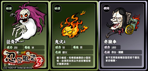 出沒在鬼島各地、模樣千奇百怪的妖怪與巨大的妖怪造型機關,也是本次鬼島改版的重要角色。物理攻擊與炎系忍術都難以對付的「鬼火」、會使用金縛之術的「狂骨」、讓怪木城的守衛強度與進攻難度都同時更上一層樓。
