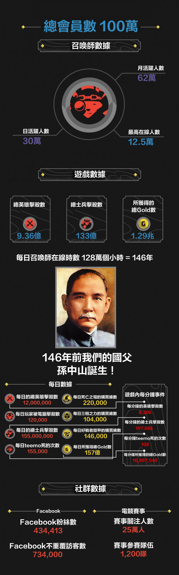 Garena 統計,遊戲從 2011/8/18 推出後,平均每日所有台灣玩家在線時間的加總達 128 萬個小時,相當於 146 年光陰,從現在回推,146 年前也恰恰好是國父-孫中山先生的誕生年。