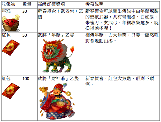 英雄三國 HERO》遊戲之中,在進行『防守』時,會隨機出現「財神爺」和「年獸」,這時候玩家只要擊敗年獸就可以得到「爆竹」或「年糕」,而擊敗財神爺,則可以得到「紅包」。「年糕」、「紅包」,只要收集一定數量,不用加價,直接就可以兌換高級虛寶獎勵。