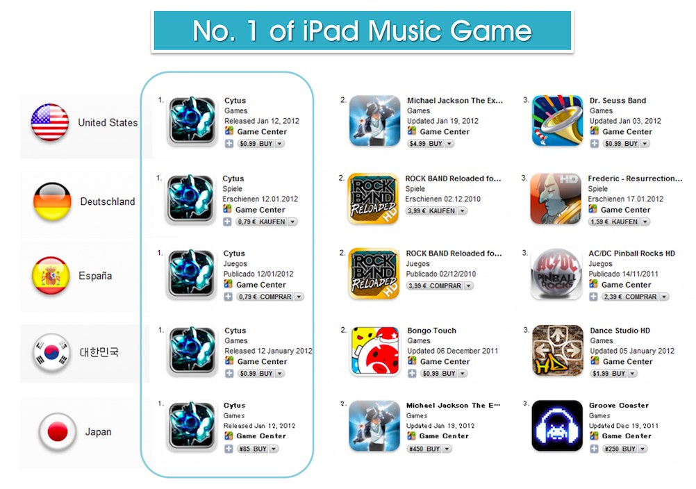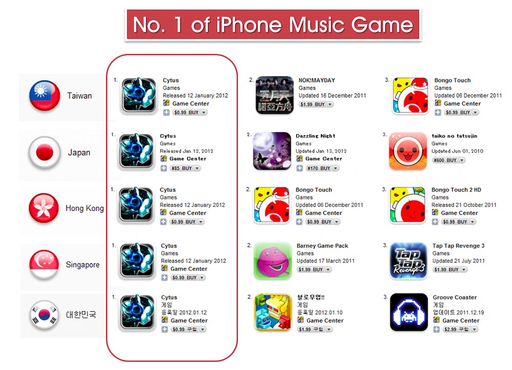 Cytus》後,以炫麗的畫面及音樂,於短短一周的時間內獲得全球玩家的回饋響應,在歐美亞太地區近三十個國家締造音樂類遊戲第一名的佳績。