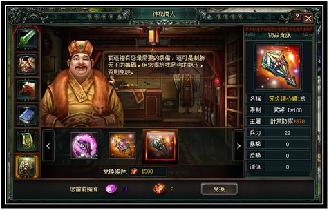 臥龍吟》全新版本「戰龍於野」推出後,神秘商人神奇出現。當主城等級達到 110 級後,主城內會出現神秘商人,玩家可以用徐州呂布以後軍團掉落的至尊玉器—龍玉,兌神秘商人的設備 (隨機附加屬性),而且掉落紫色、橙色裝備的副本軍團會掉落對應顏色的龍玉,掉落機率高達100%!