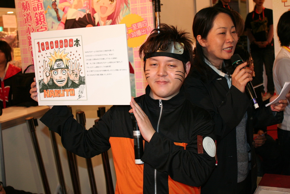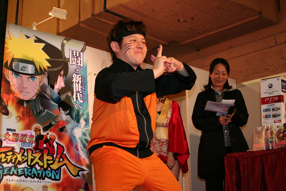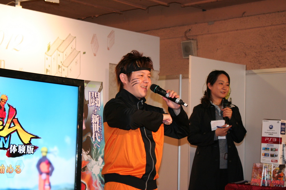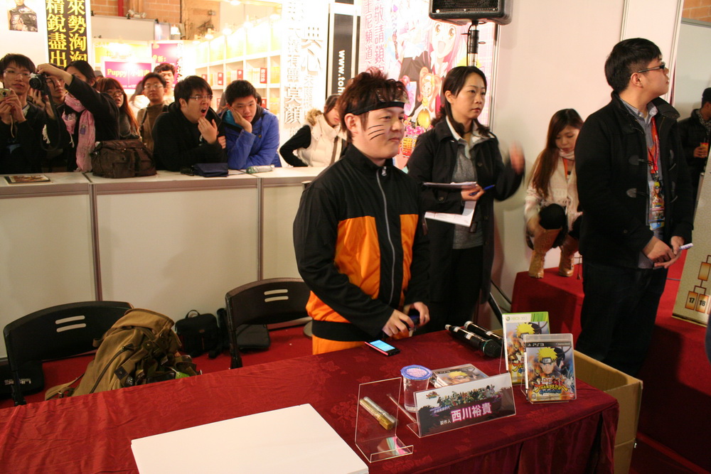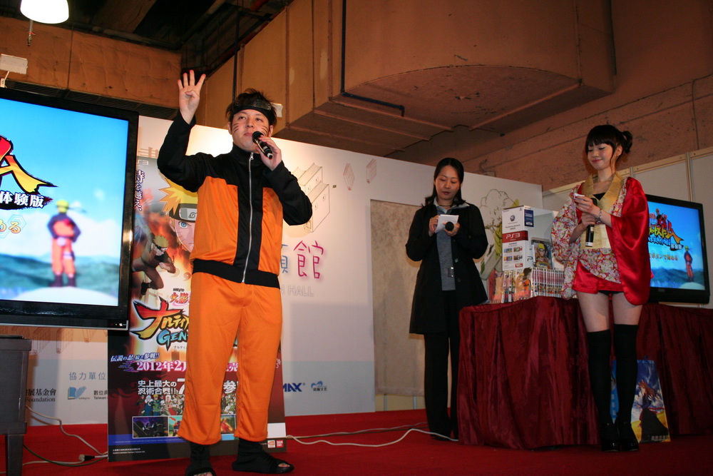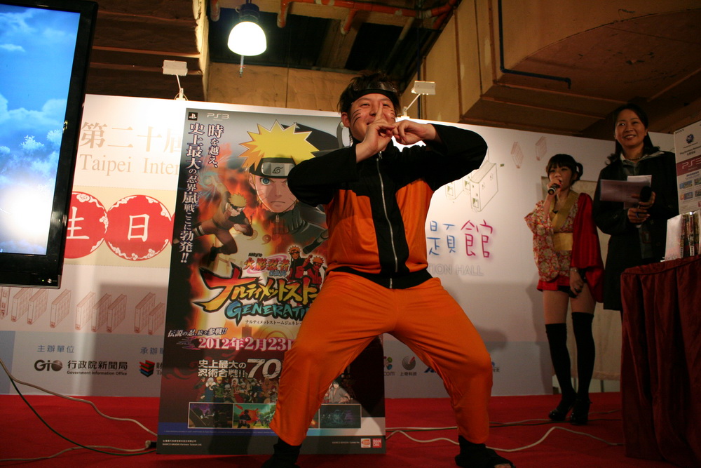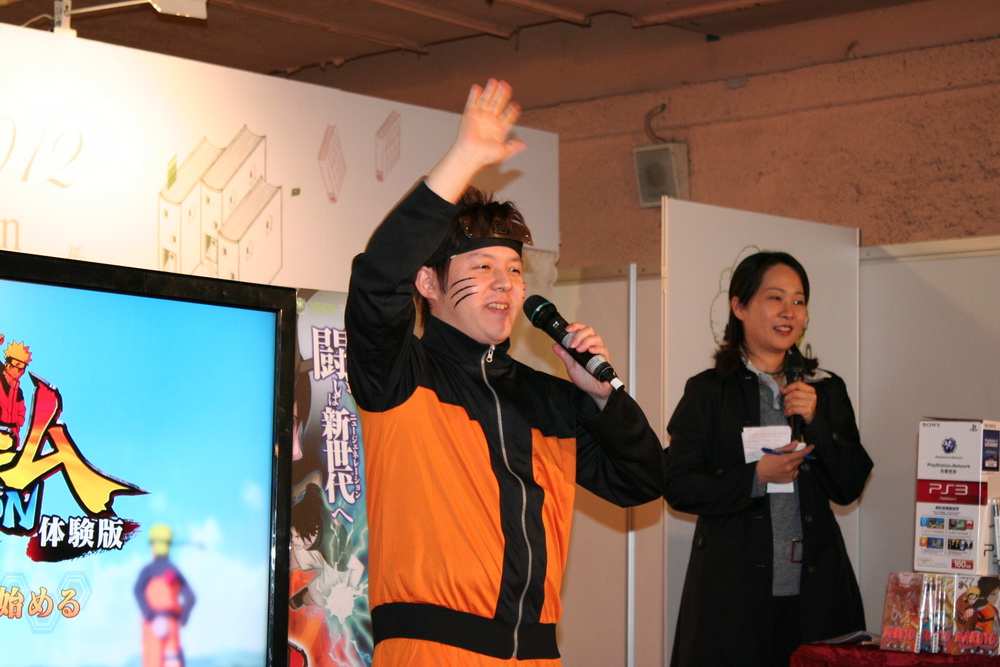 火影忍者 疾風傳》主角「漩渦鳴人」的扮相現身,馬上引起現場玩家一陣驚呼。而本身也身為火影迷的製作人馬上熱血的擺出「漩渦鳴人」招牌忍術「影分身之術」的結印動作,現場氣氛一口氣就達到了頂點!