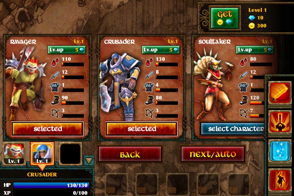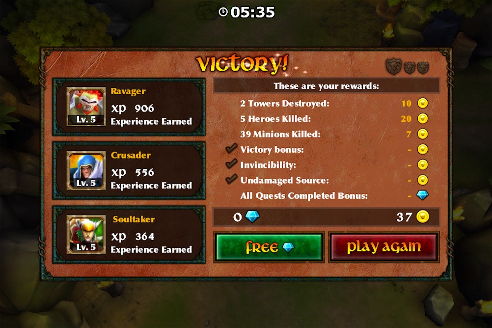目前遊戲分成金幣、鑽石兩種貨幣,金幣部分只要在關卡中獲得勝利就能取得,而鑽石則是完成每個關卡附加的三個任務條件,即可獲得 5 個鑽石,有了這些貨幣就能購買更多種類的英雄、裝備以及道具來使用。