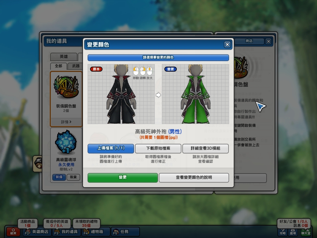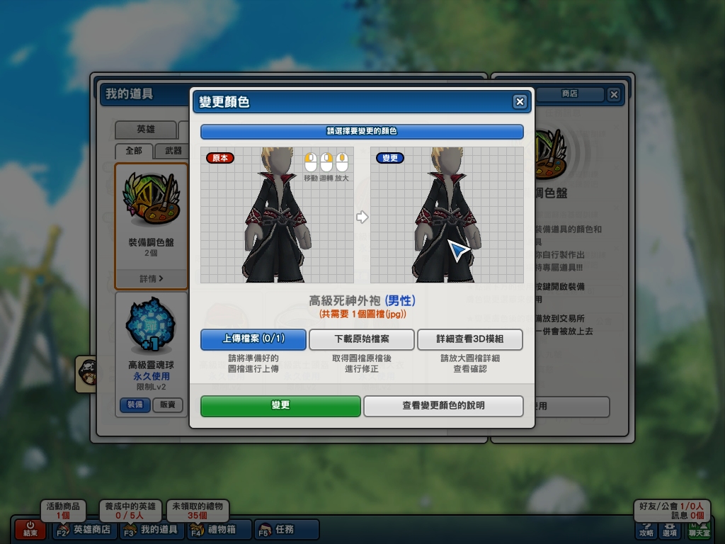 步驟 4:變更好後再次進入該裝備的調色頁面,然後這次改成「上傳檔案」。上傳好後可以預覽變更後的結果,OK 就按下確認吧!