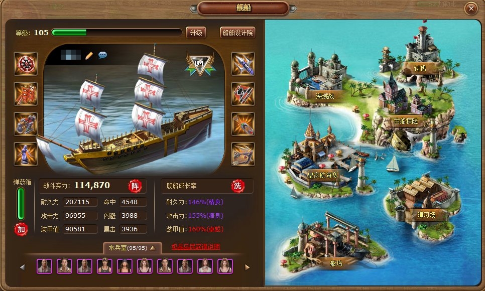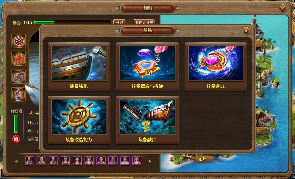 在船艦系統之中,有一項名為「船塢」的系統,在這裡玩家可以進行船艦的裝備強化、改造、融合、紋章合成等功能,玩家與船艦一起成長,一點一滴地為船艦增加實力,為日後挑戰海上霸主地方奠定深遠的基礎!