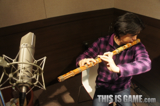 這裡我們想加入一些含有東洋的「恨」旋律,西洋的節奏和音色佔80%,剩下的希望用東洋的旋律和感性來表現。還有為了加入韓國色彩,也與國樂演奏者交流,應用大笒(一種長笛,如圖所示)或伽耶琴等。