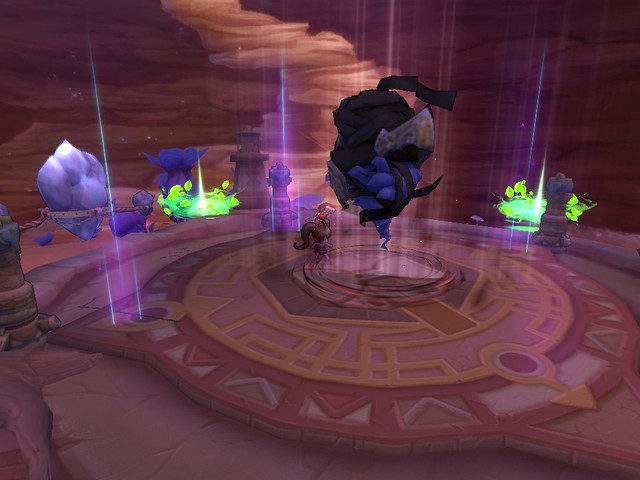 進入「荒漠迷境」後,入口分左右兩條路,建議玩家平均分配左右各五人。兩邊先各自清理前方小怪之後,首先會來到第一個互相影響的關聯區域,左邊是狂嵐.阿昌塔,右邊是聖潔之塔,此時右邊玩家必須保護聖潔之塔直到左邊玩家擊倒狂嵐.阿昌塔。否則若是聖潔之塔被摧毀,阿昌塔會變得更加難以對付,還有若當場上攻擊聖潔之塔的怪物越多,左邊的阿昌塔周圍會出現不斷扣減該區玩家生命的嗜血圖騰,所以就算塔不小心失守了,右路夥伴還是必須快速清怪,讓左路對付阿場塔時較輕鬆。聖潔之塔旁邊每過一段時間會定時出現隱居術士-席諾,可以請他幫忙召喚赤紅魔龍來幫忙守護聖潔之塔。(※切記!若招喚此魔龍來協助防守聖潔之塔,此部分