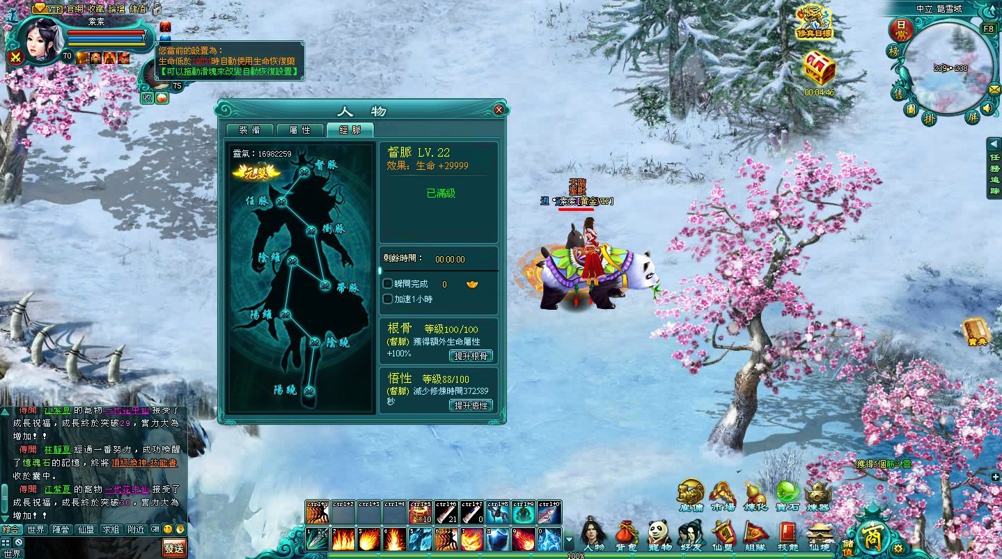 欲練神功必先打通任督二脈!玩家等級達到 12 級,經脈修煉系統將自動開啟。修煉系統可以分為經脈修煉、根骨提升和悟性提升。只需消耗一定的時間、銅錢、靈氣或是根骨提升符,則可以讓自己的各類屬性,如生命力、法力、防禦力等能力,隨之飆升。