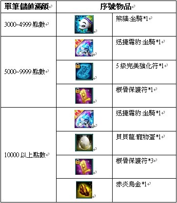 活動內容:在活動時間內,單筆儲值並分配點數滿足條件即可獲贈稀有道具物品。