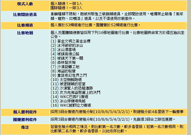 本次賽事有分成競速類和團體類,兩大類型的比賽都是以速度和性能跟對手競爭看誰能夠奪得第一名的頭銜,這次勝利條件改成積分賽,只要積分最高就有機會取得季冠軍資格,詳情內容可以參閱 beanfun!樂豆全國公開賽官方網站。