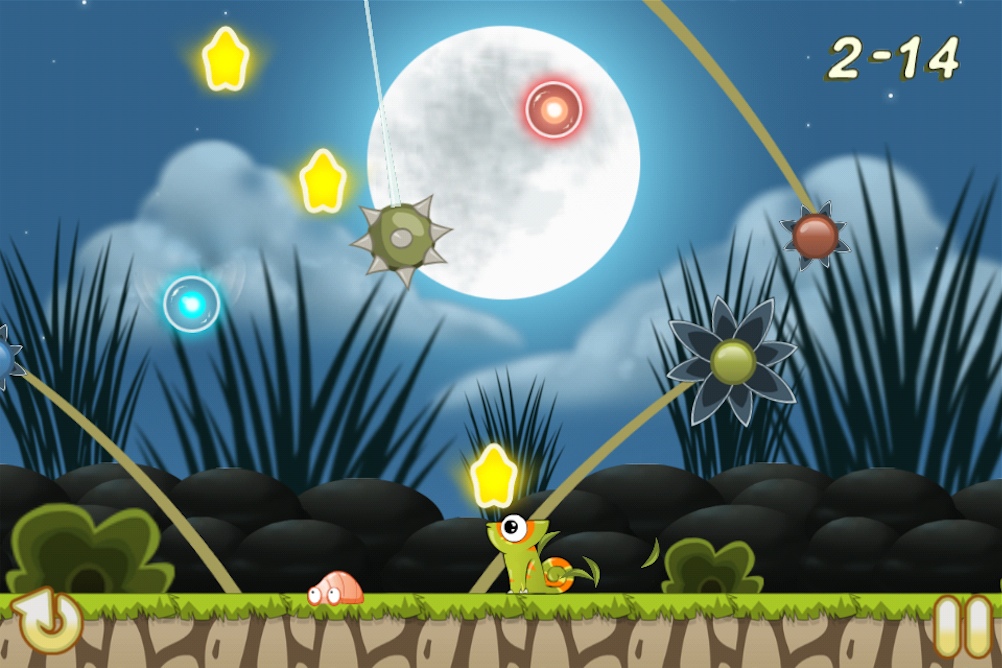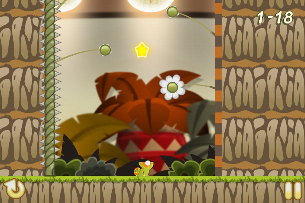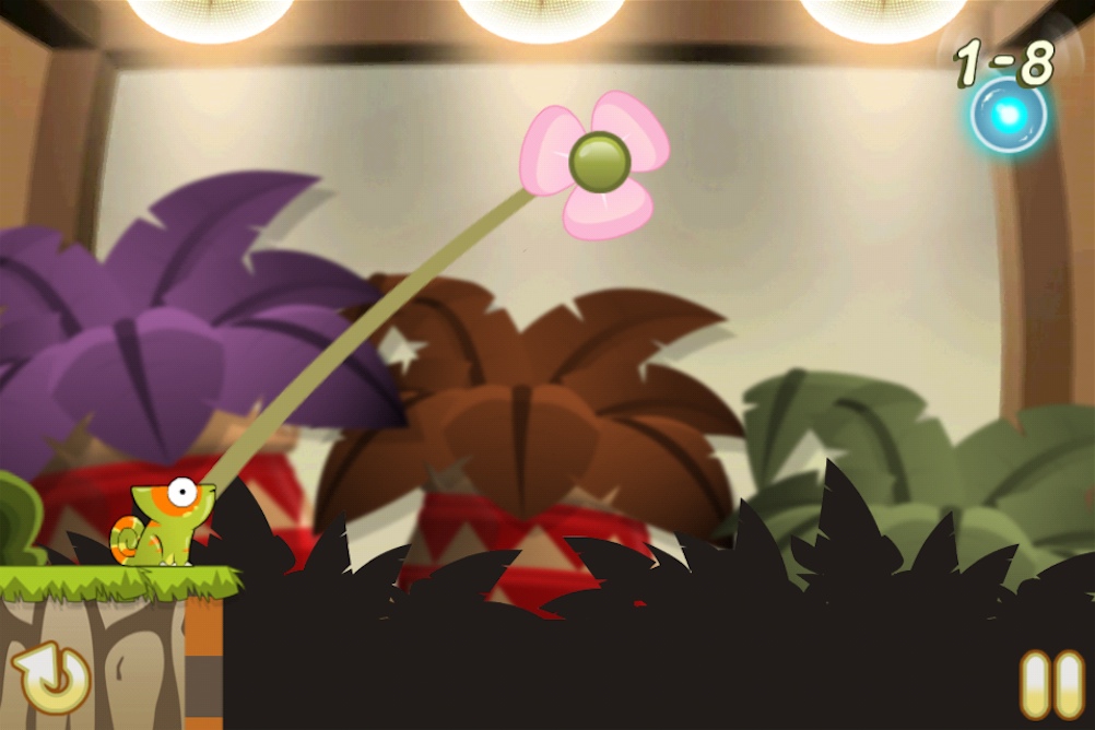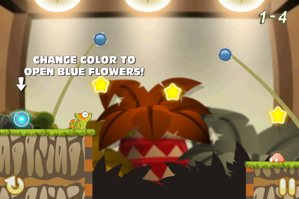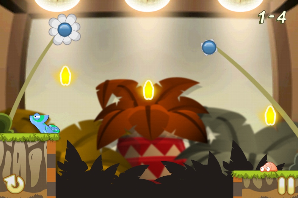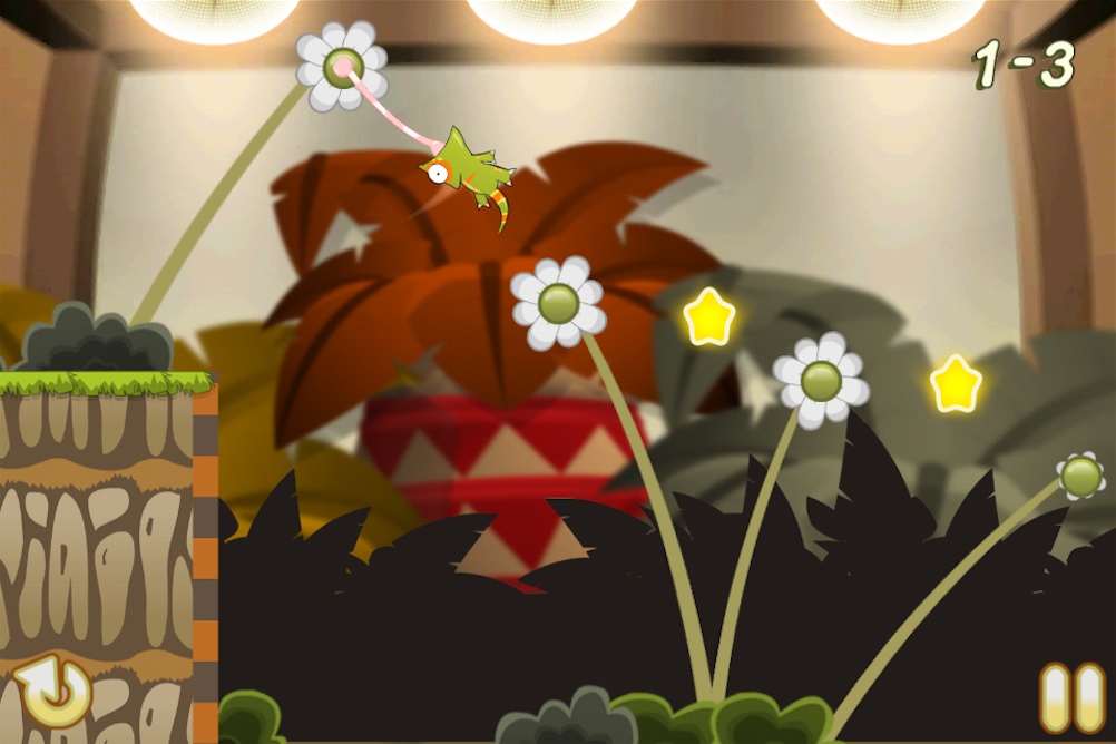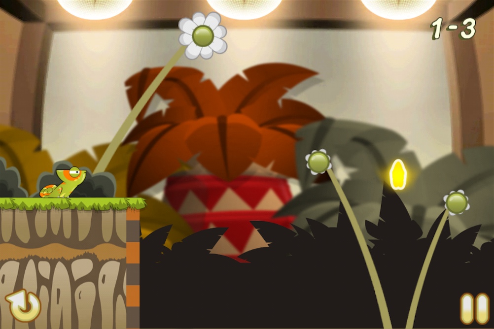 變色龍所在的地面上可以利用點擊畫面的方式直接左右移動,但是一但到了該地階邊緣處,要往下走或往上爬都必須透過將舌頭伸長成繩套,點擊連結盛開的花朵,然後才能以宛若