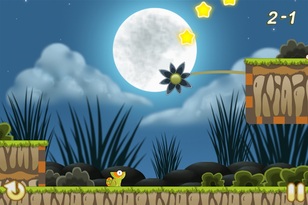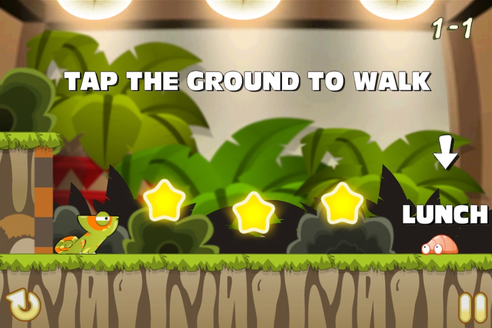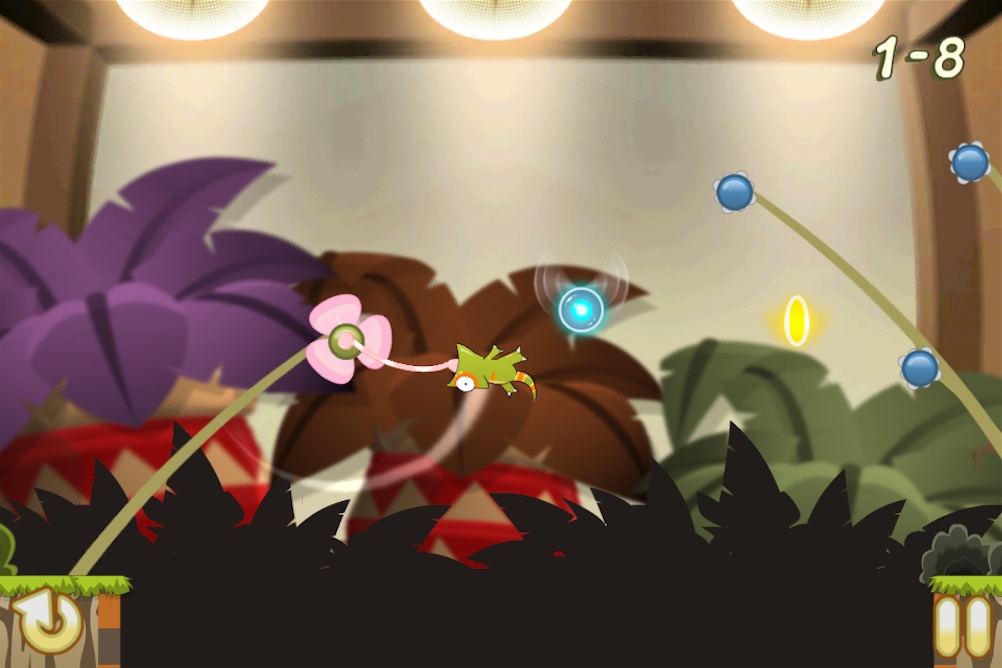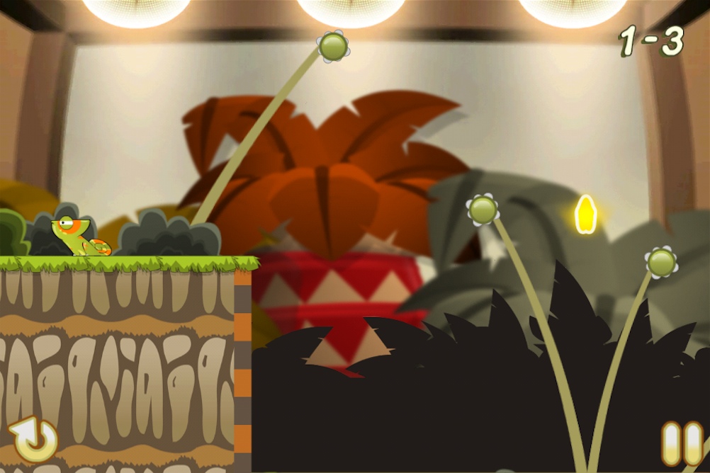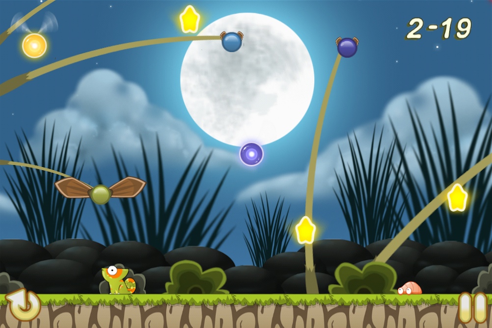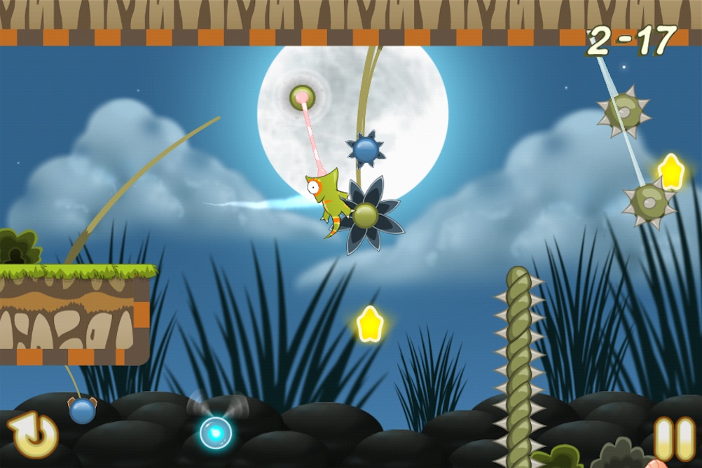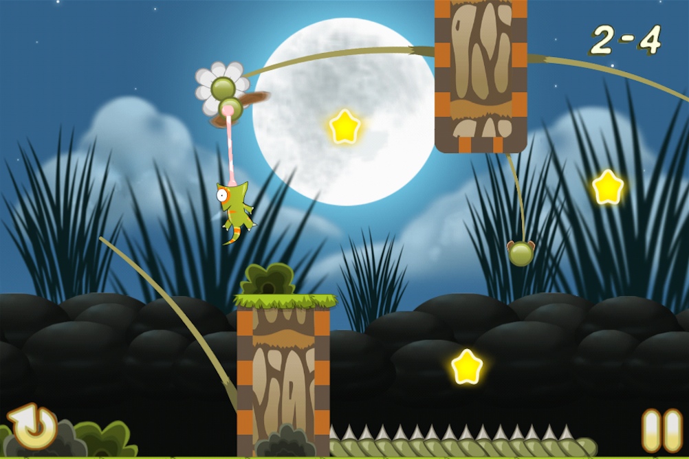 變色龍所在的地面上可以利用點擊畫面的方式直接左右移動,但是一但到了該地階邊緣處,要往下走或往上爬都必須透過將舌頭伸長成繩套,點擊連結盛開的花朵,然後才能以宛若