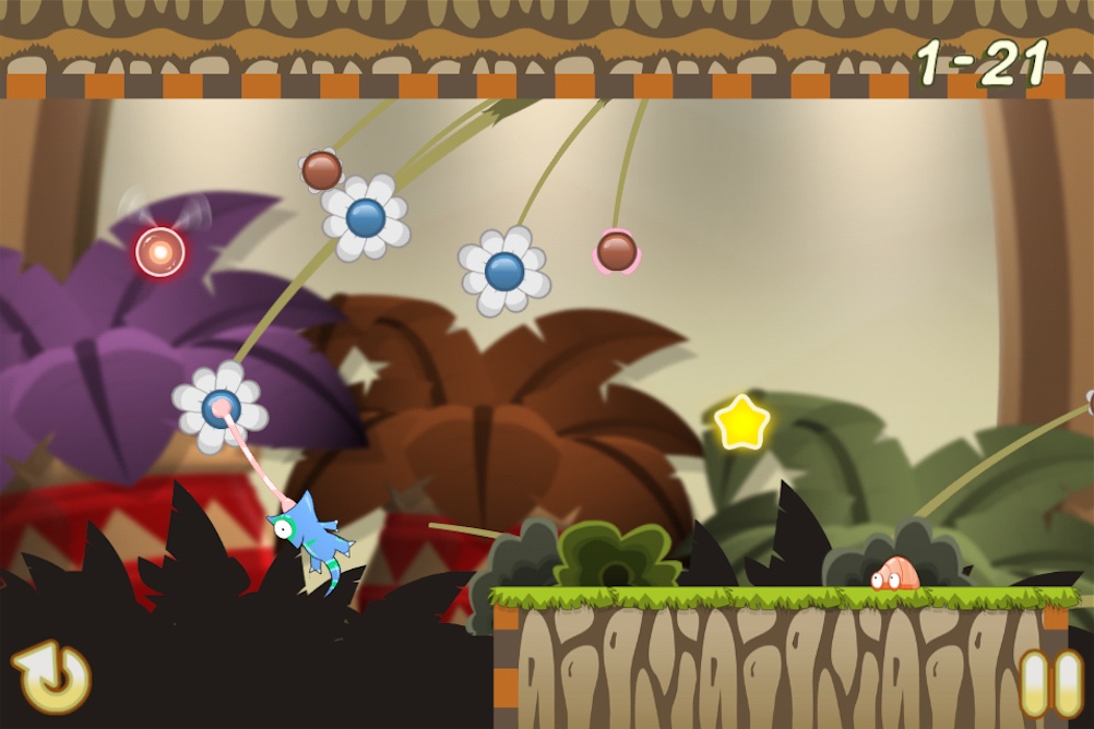 當然如果只是要破關的話是不需要那麼大費周章,遊戲有趣之處在於每個關卡提供玩家收集而在場地上零散的三個星星,每次過關後會在關卡上顯示玩家所收集到的星星數量,如果要在破關的同時又能收集到全部的星星以達成完美破關,就必須思考選擇的花朵的順序、擺盪時放手的時機以及