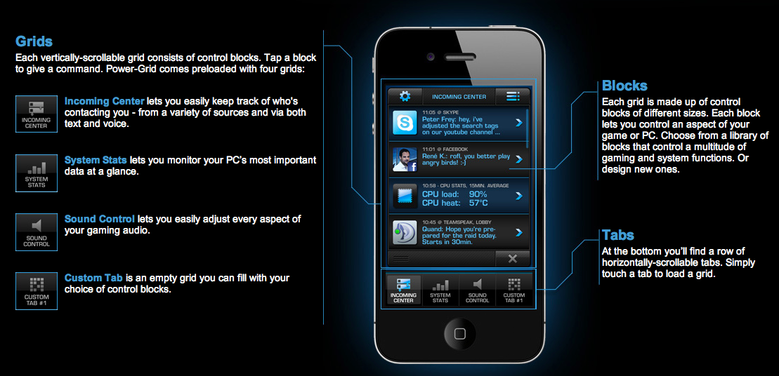 「統計控制」網格亦隨著 Power-Grid 而預先載入,使遊戲玩家能迅速且輕易地經由智慧型手機監控電腦的活動資訊,這些資訊包含 CPU 的狀態、硬碟空間、與網路流量。