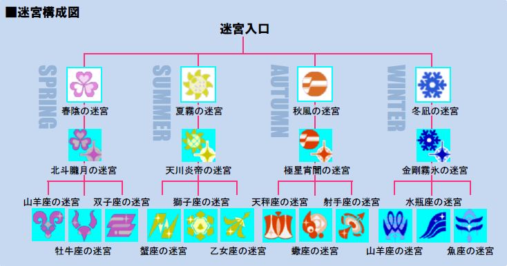 「星屑之迷宮」的入口處有分為「春」、「夏」、「秋」、「冬」四季的迷宮。而四季迷宮到了地下 10 樓又會再分歧出 3 個迷宮,連接著各星座所掌控的 12 種迷宮。