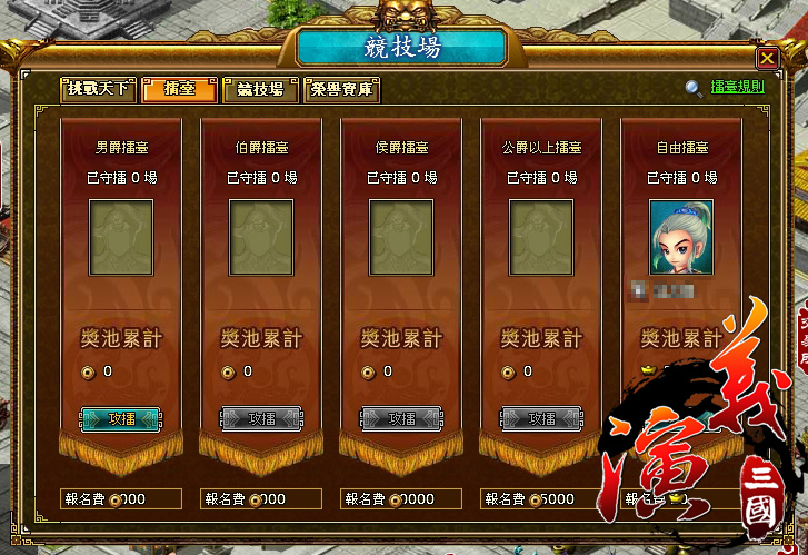 參與擂臺賽玩法需要交納一定數量的報名費,不同的擂臺所需的金額也不相同。國士擂臺需要交納1000銅幣、男爵子爵擂臺需要交納5000銅幣、伯爵侯爵擂臺需要交納10000銅幣、公爵以上擂臺需要交納25000銅幣,而自由擂臺則需要交納20金幣作為報名費。